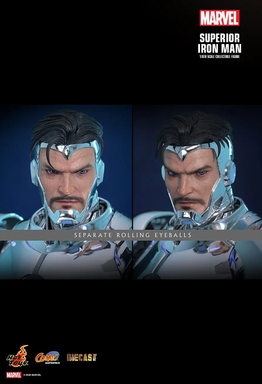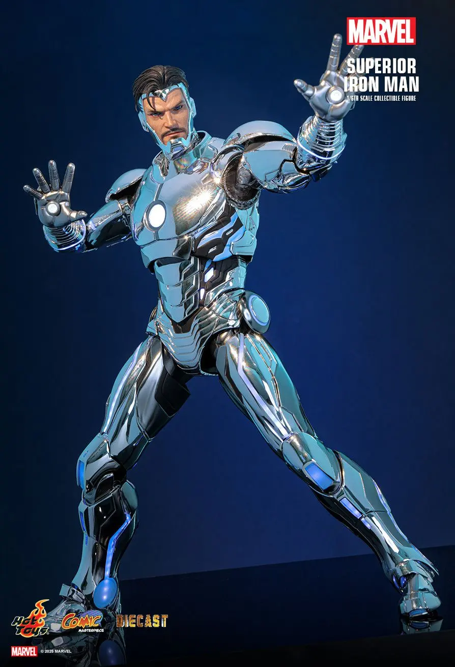 Hot Toys is thrilled to announce the 1/6th scale Superior Iron Man Collectible Figure. Crafted with premium die-cast materials, the armor is coated in gleaming metallic silver with an electroplating finish. The removable chest armor reveals intricate internal mechanics, offering a visual glimpse into the mechanized wonders beneath. This figure features full-body LED lighting powered via a single USB-C port, casting an imposing blue glow when fully activated. Luminous points include arms, palms, legs, abdomen, circle-shaped Arc Reactor on chest, and more. The set includes six interchangeable hands to recreate combat and heroic poses. Completing the display is a specially designed metallic silver figure stand with LED light-up base, casting a reflective glow across the armor. A Special Edition only available in selected markets will include a specially designed Superior Iron Man metal collectible card with display case.