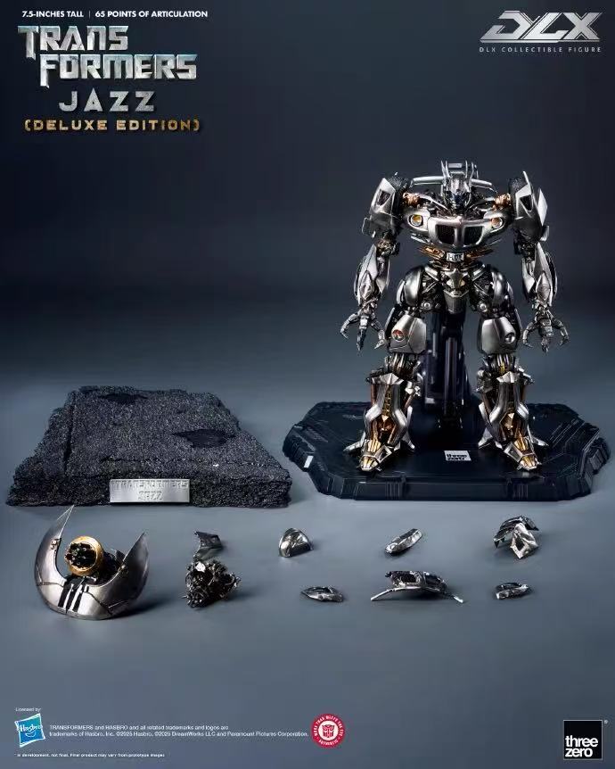 From the live-action film Transformers (2007), Jazz – Optimus Prime’s second-in-command – makes his debut in the threezero DLX series! Meticulously crafted by threezero’s new R&D team, this figure stays true to the movie’s design while adding excellent tactile quality and high playability to the legendary character. This Deluxe Edition exclusively includes a damaged spine, a set of seven-piece interchangeable battle-damaged outer-armor, and a diorama base.